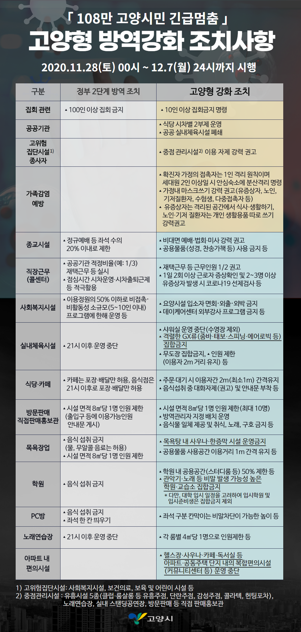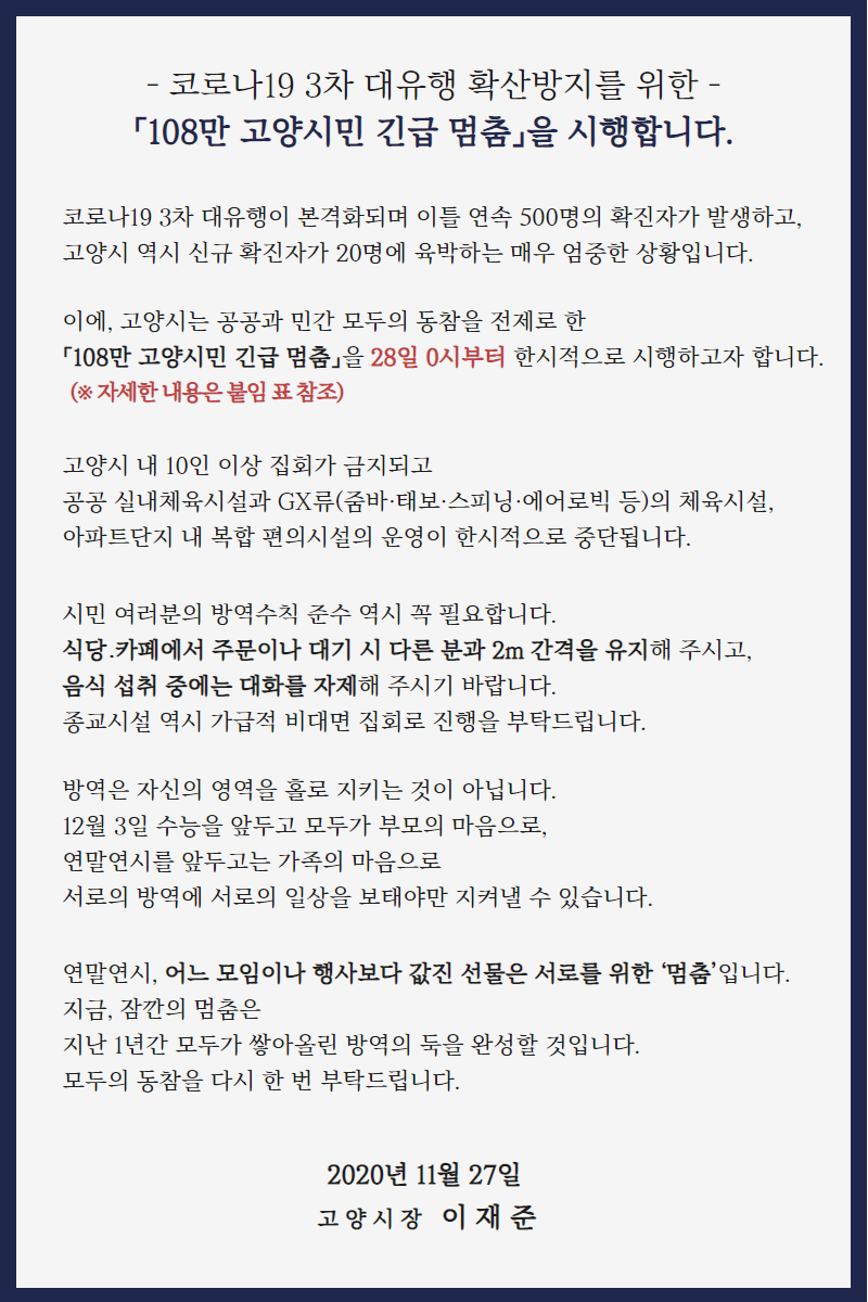 코로나19 3차 대유행 확산방지를 위한 108만 고양시민 긴급 멈춤