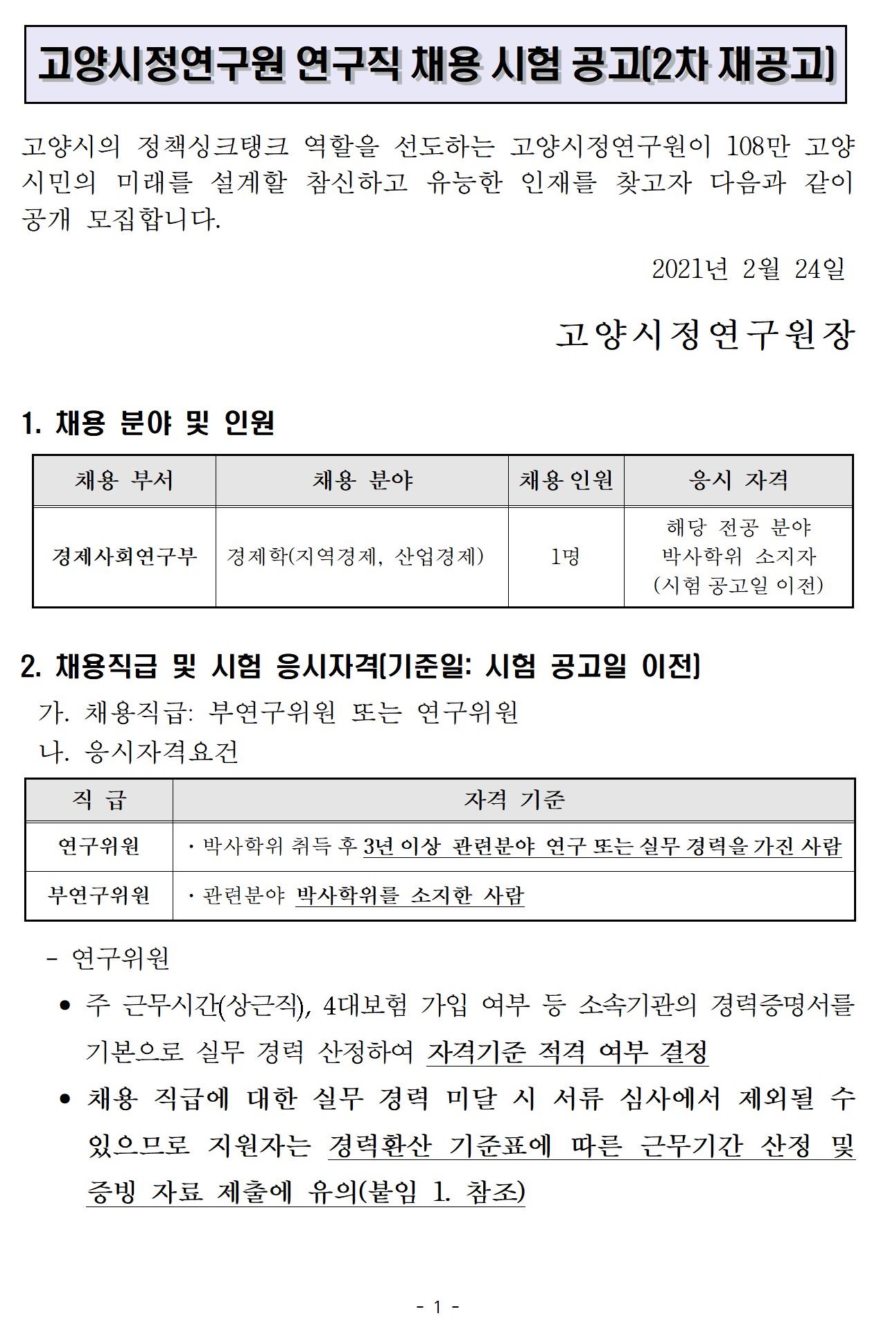 고양시정연구원 연구직 채용 시험 공고(2차 재공고).hwp