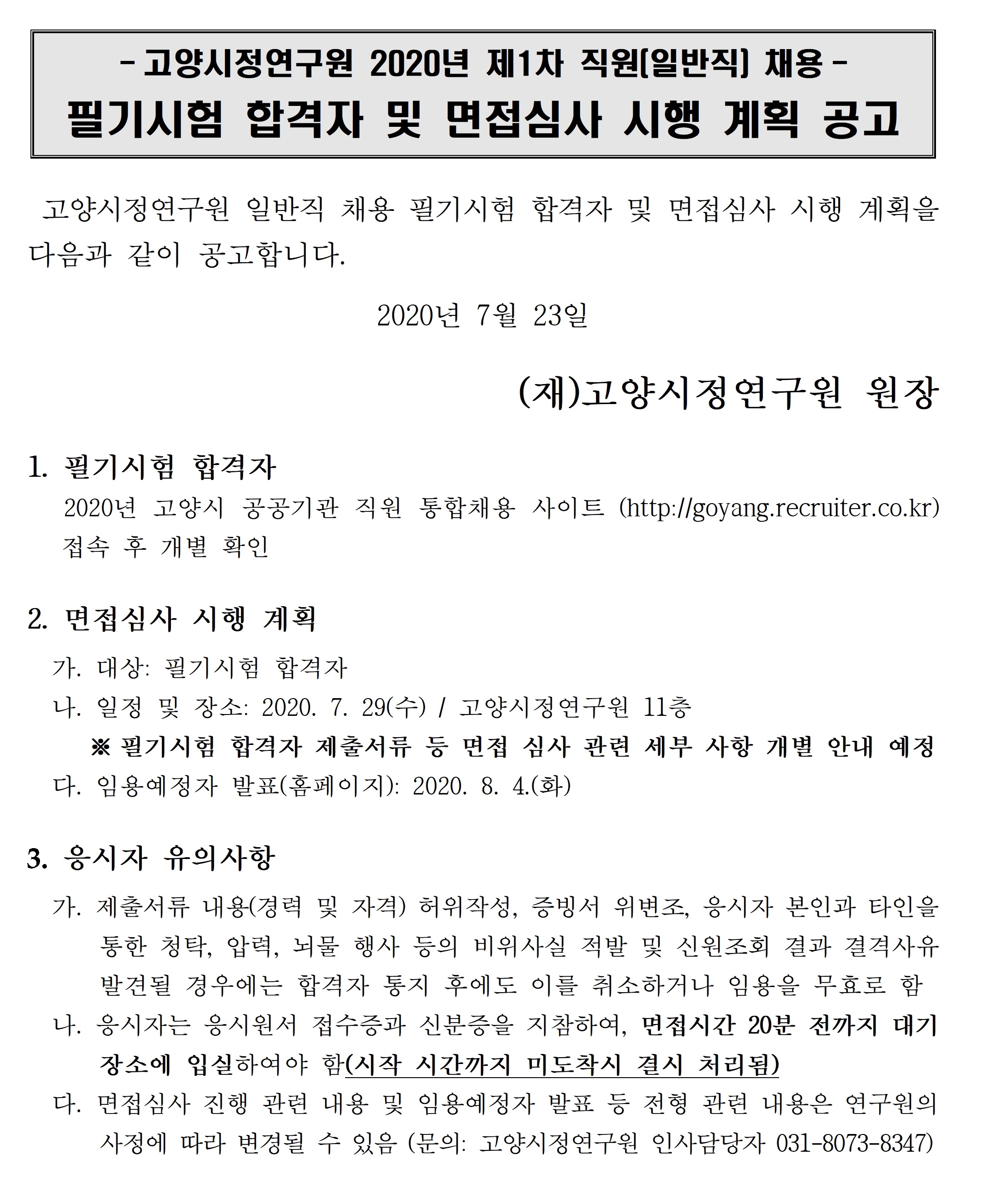 2020년 고양시 공공기관 직원(일반직) 통합채용 필기시험 합격자 및 면접심사 계획 공고