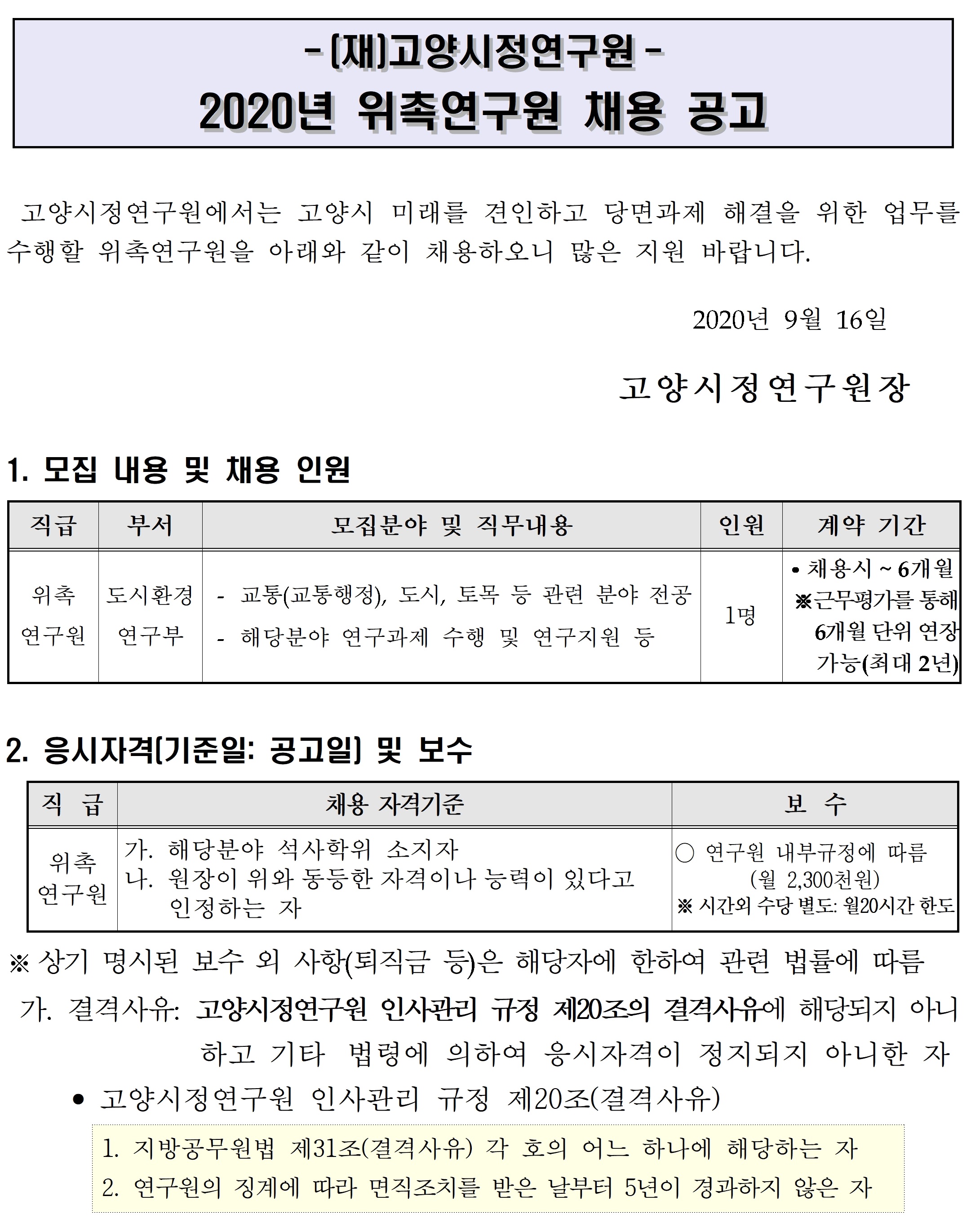 [제2020-24호] 고양시정연구원 2020년 위촉연구원 채용 공고(재공고)