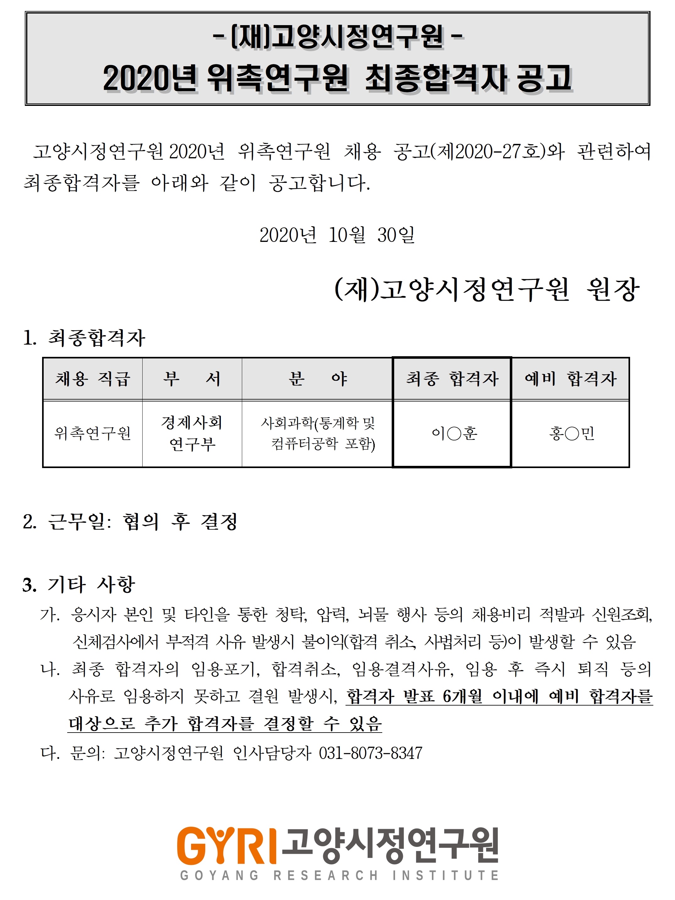 [제2020-29호] 고양시정연구원 위촉연구원 최종합격자 공고문