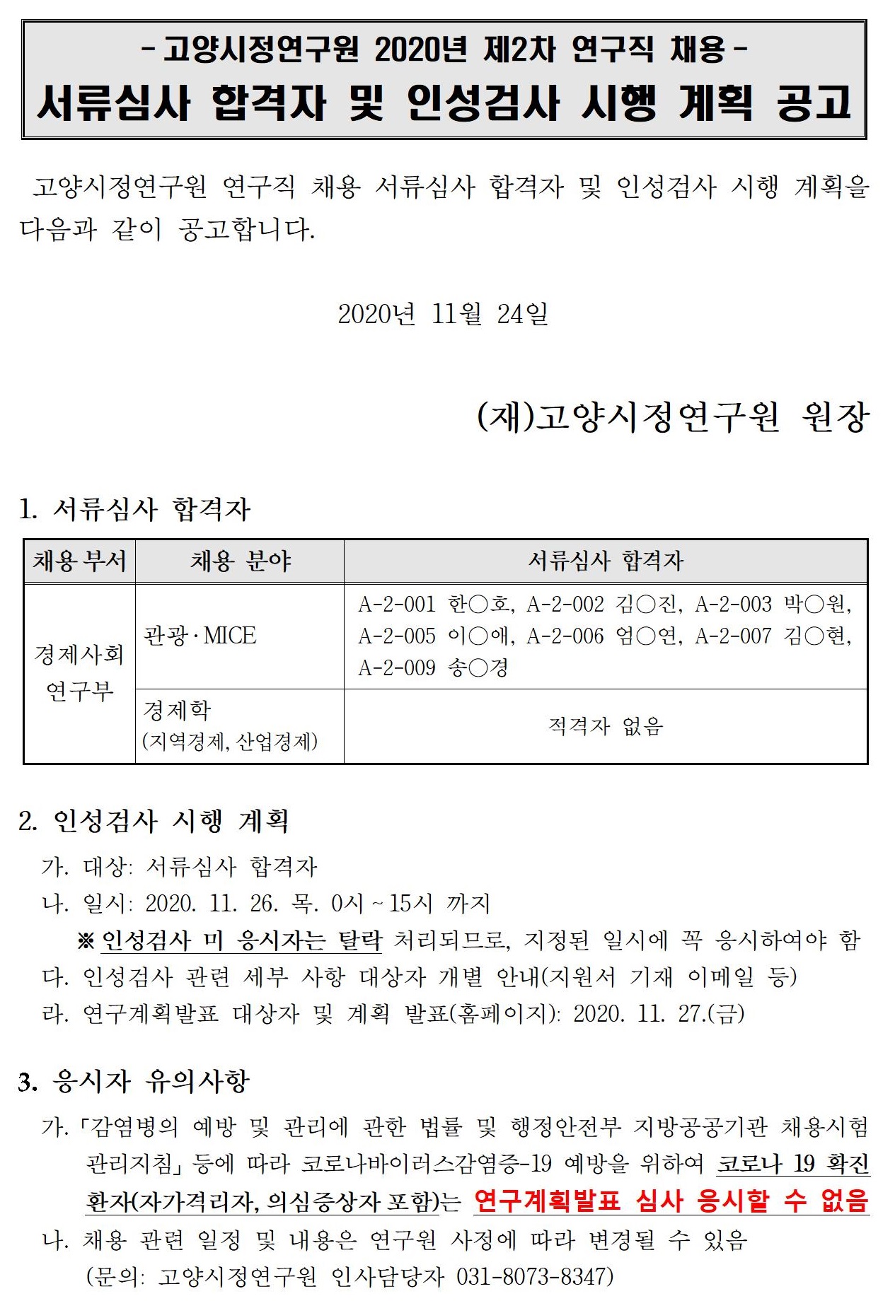 [제2020-33호] 2020년 제2차 고양시정연구원 연구직 채용 서류심사 합격자 및 인성검사 시행 계획 공고