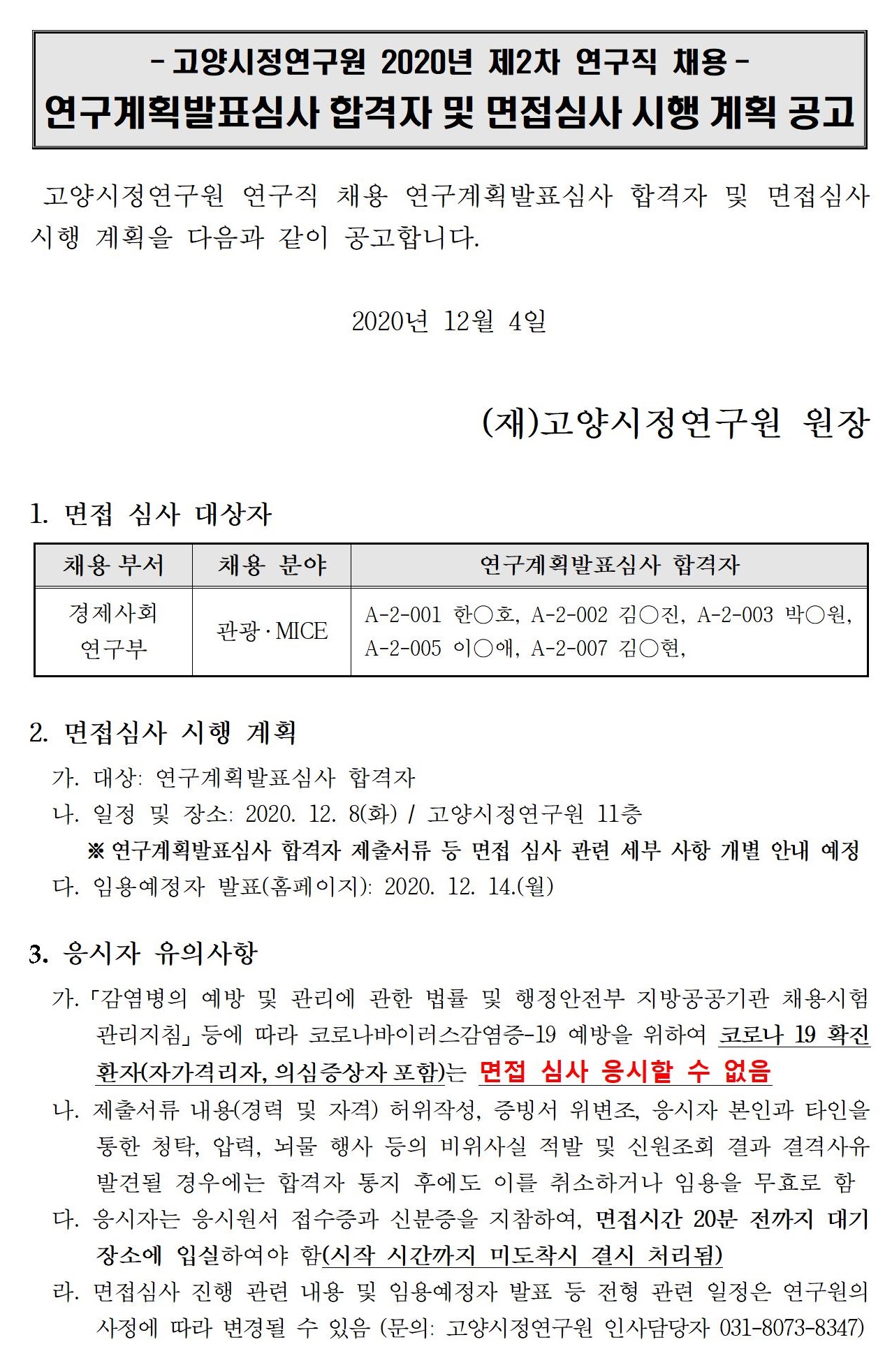 [제2020-35호] 2020년 제2차 고양시정연구원 연구직 채용 연구계획발표심사 합격자 및 면접심사 시행 계획 공고