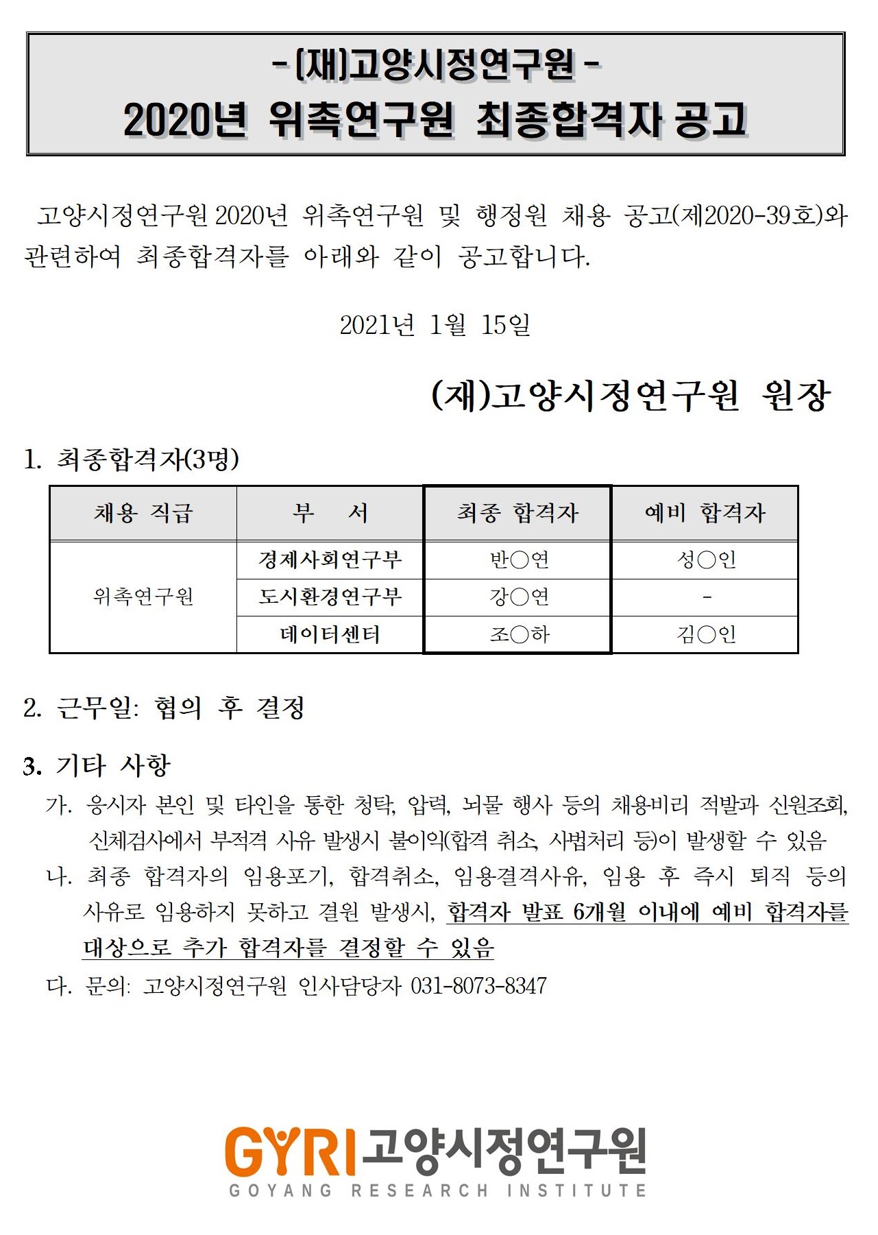 [제2021-1호] 고양시정연구원 위촉연구원 최종합격자 공고문