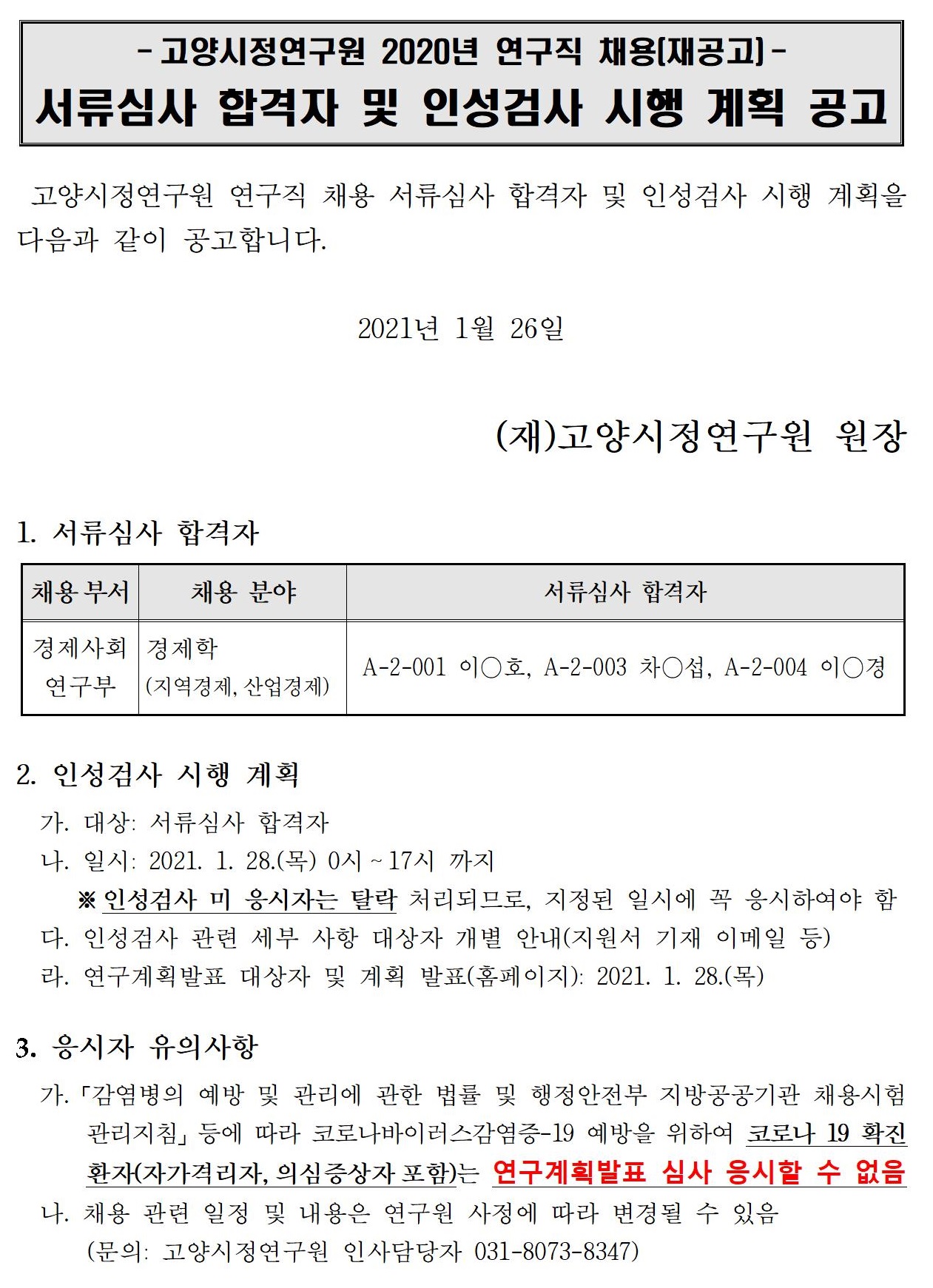 [제2021-3호] 고양시정연구원 연구직 채용 서류심사 합격자 및 인성검사 시행 계획 공고
