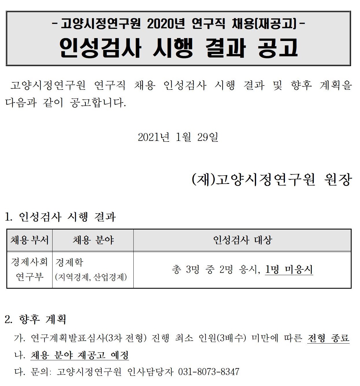 [제2021-4호] 고양시정연구원 연구직 채용 인성검사 시행 결과 공고