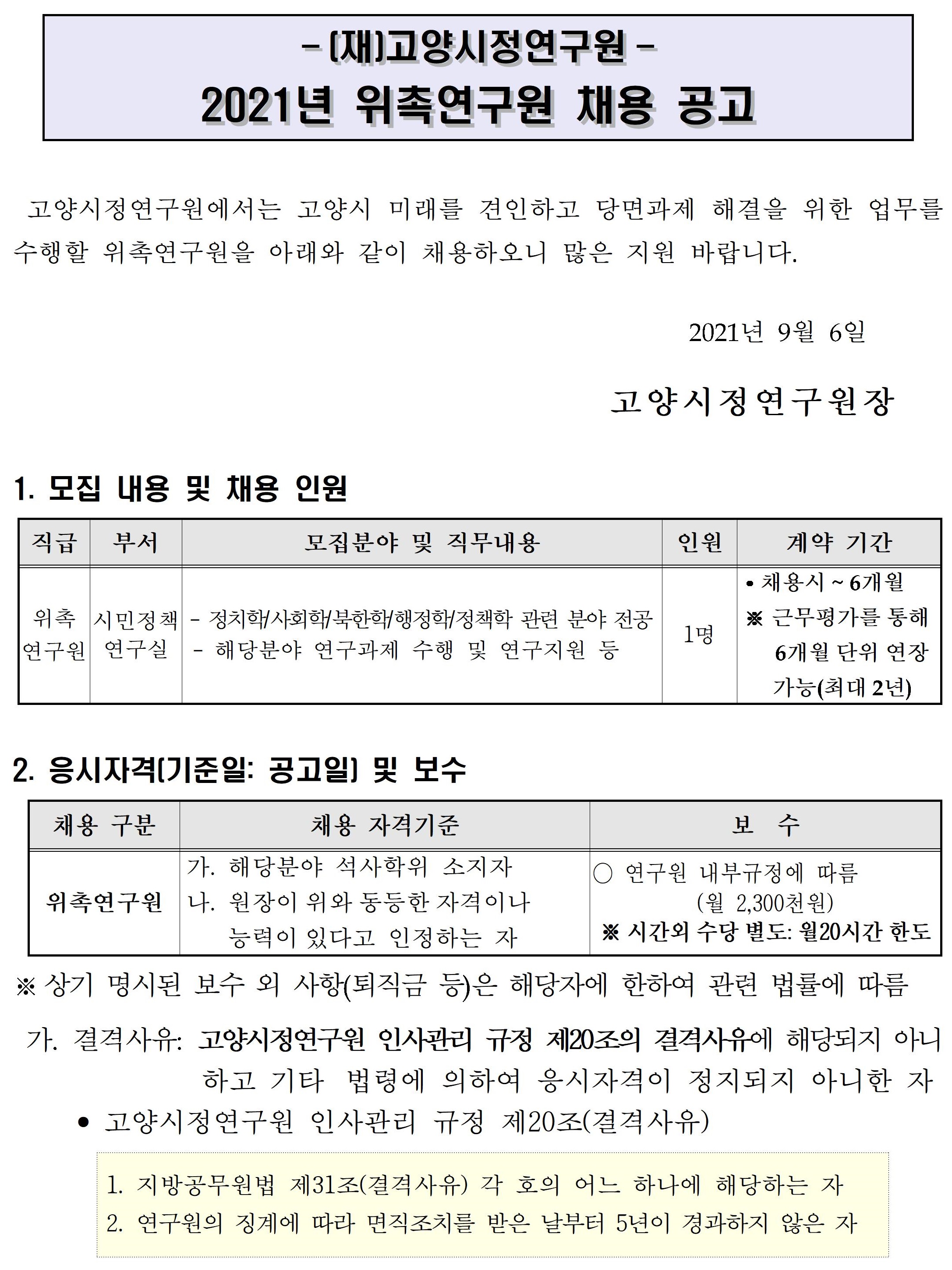 [제2021-36호] 고양시정연구원 2021년 위촉연구원 채용 공고(재공고)