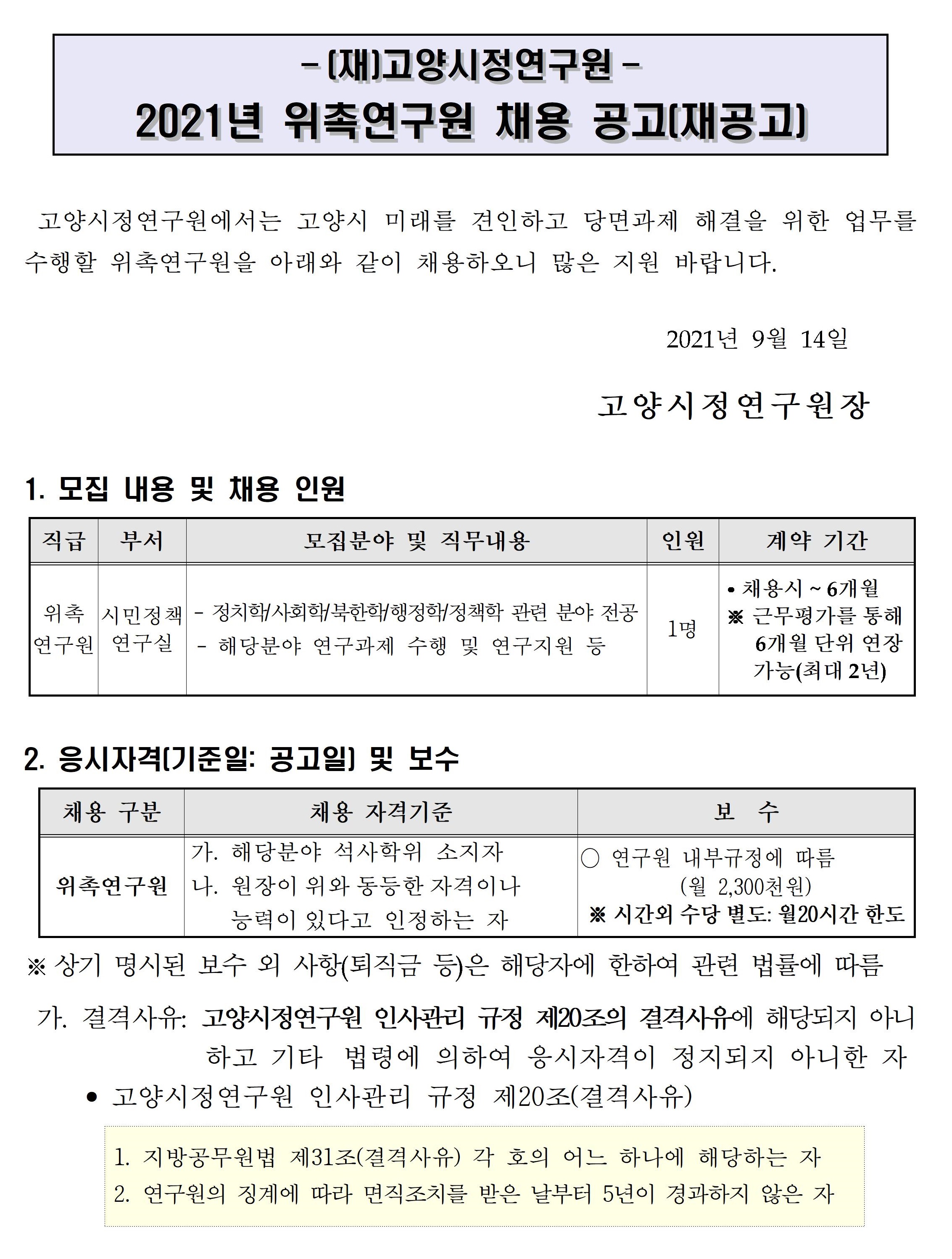 재공고_고양시정연구원 2021년 위촉연구원 채용 공고문(지원서 서식 포함).hwp