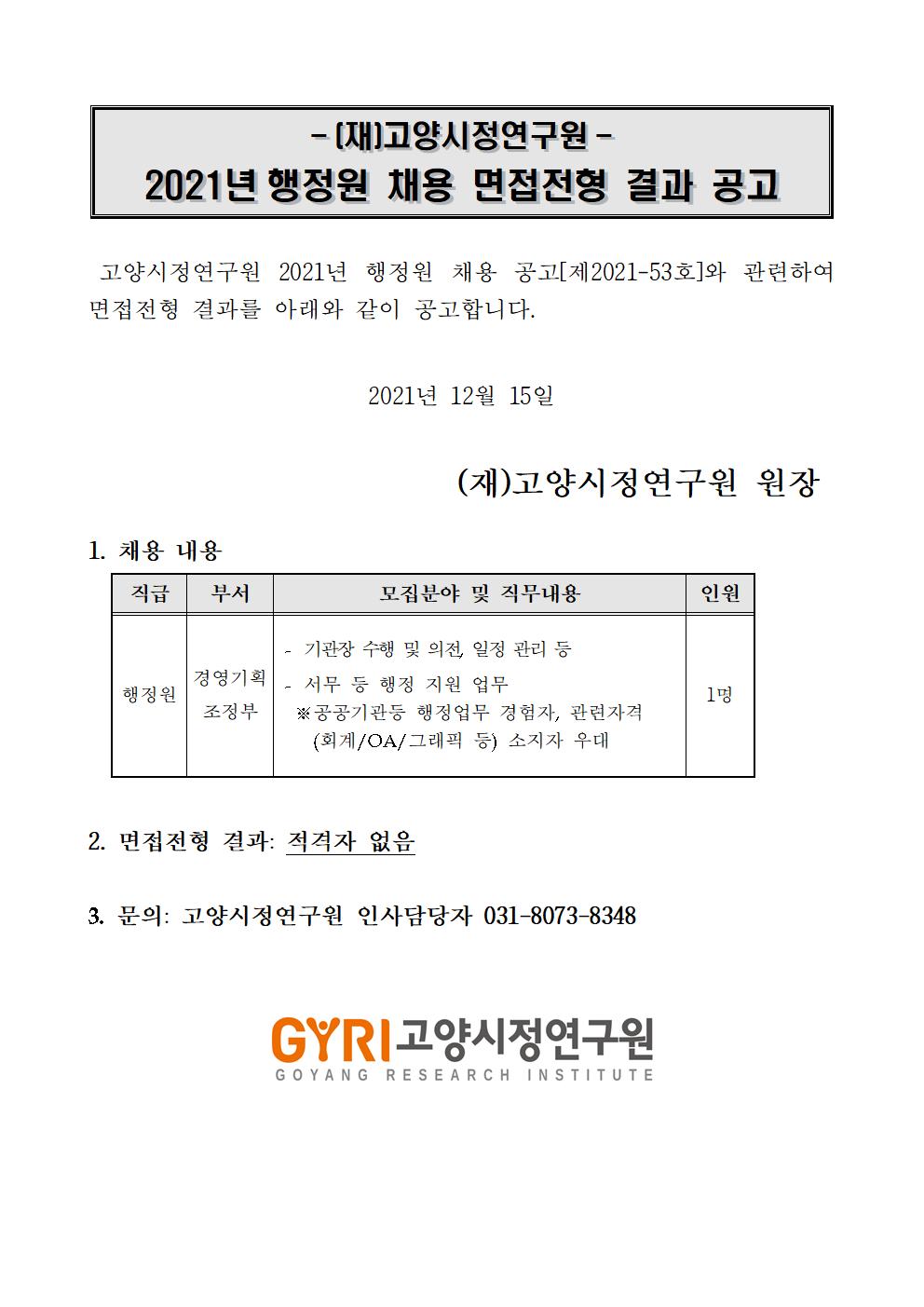 [제2021-54호] 고양시정연구원 2021년 행정원 채용 면접전형 결과 공고