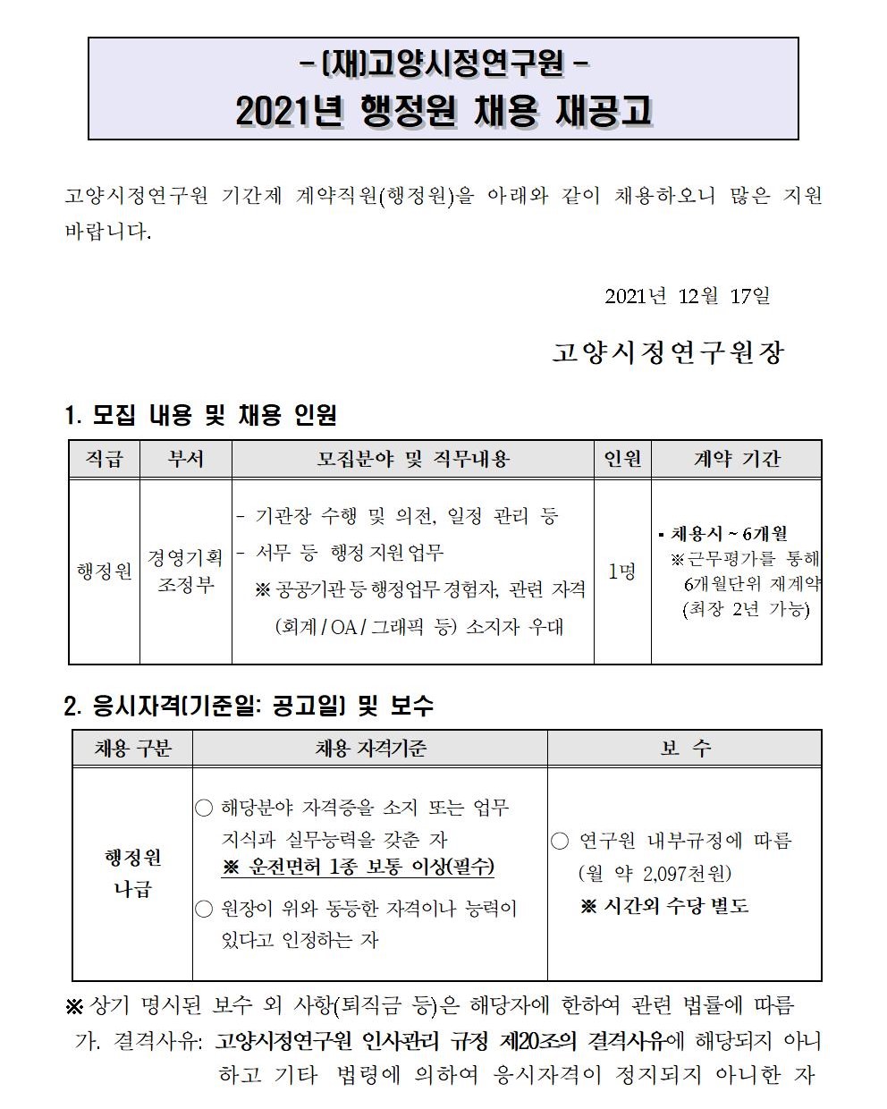 고양시정연구원 2021년 정원외 직원(행정원) 채용 공고문(재공고_지원서 서식 포함).hwp