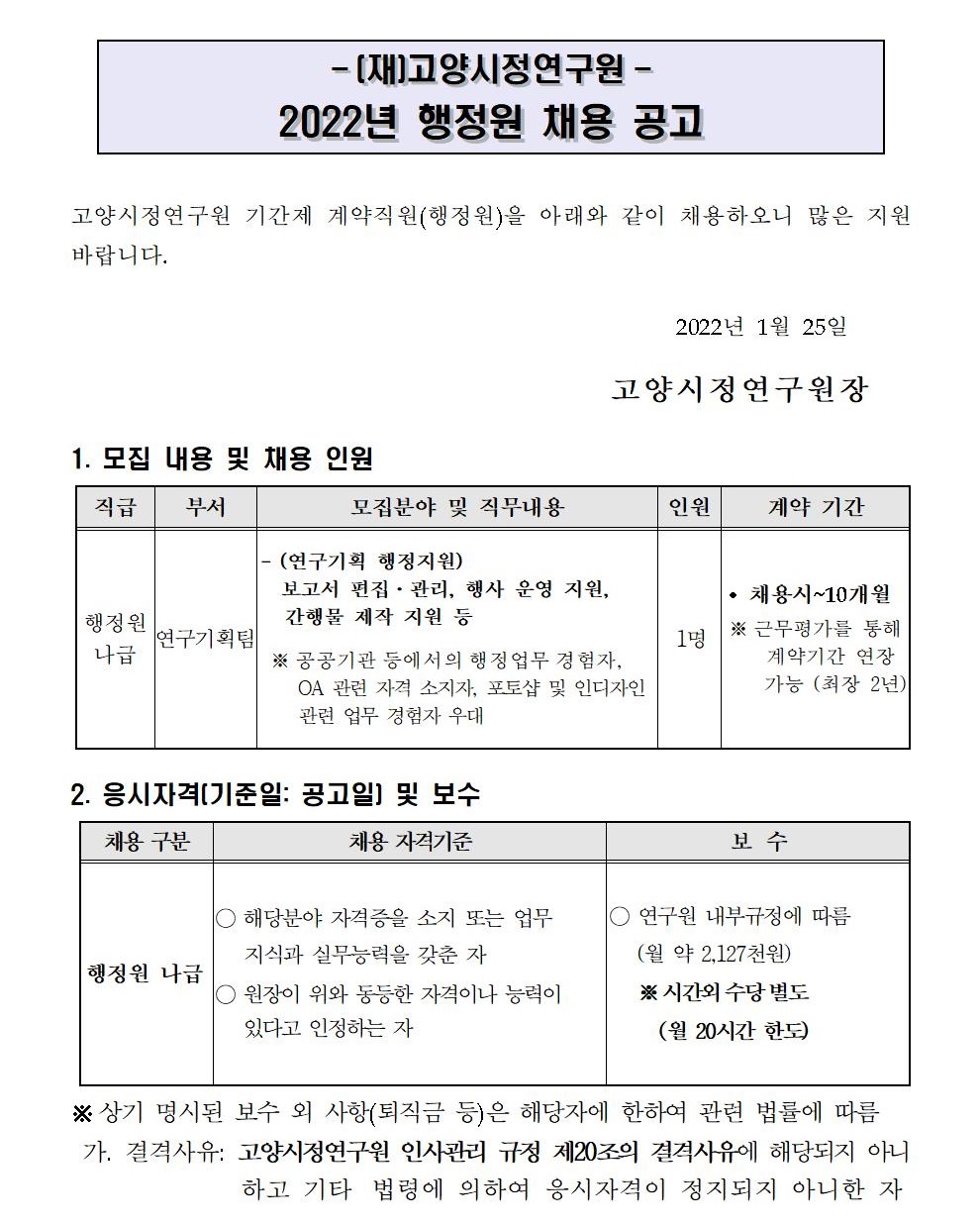 [제2022-1호] 고양시정연구원 2022년 행정원 채용 공고