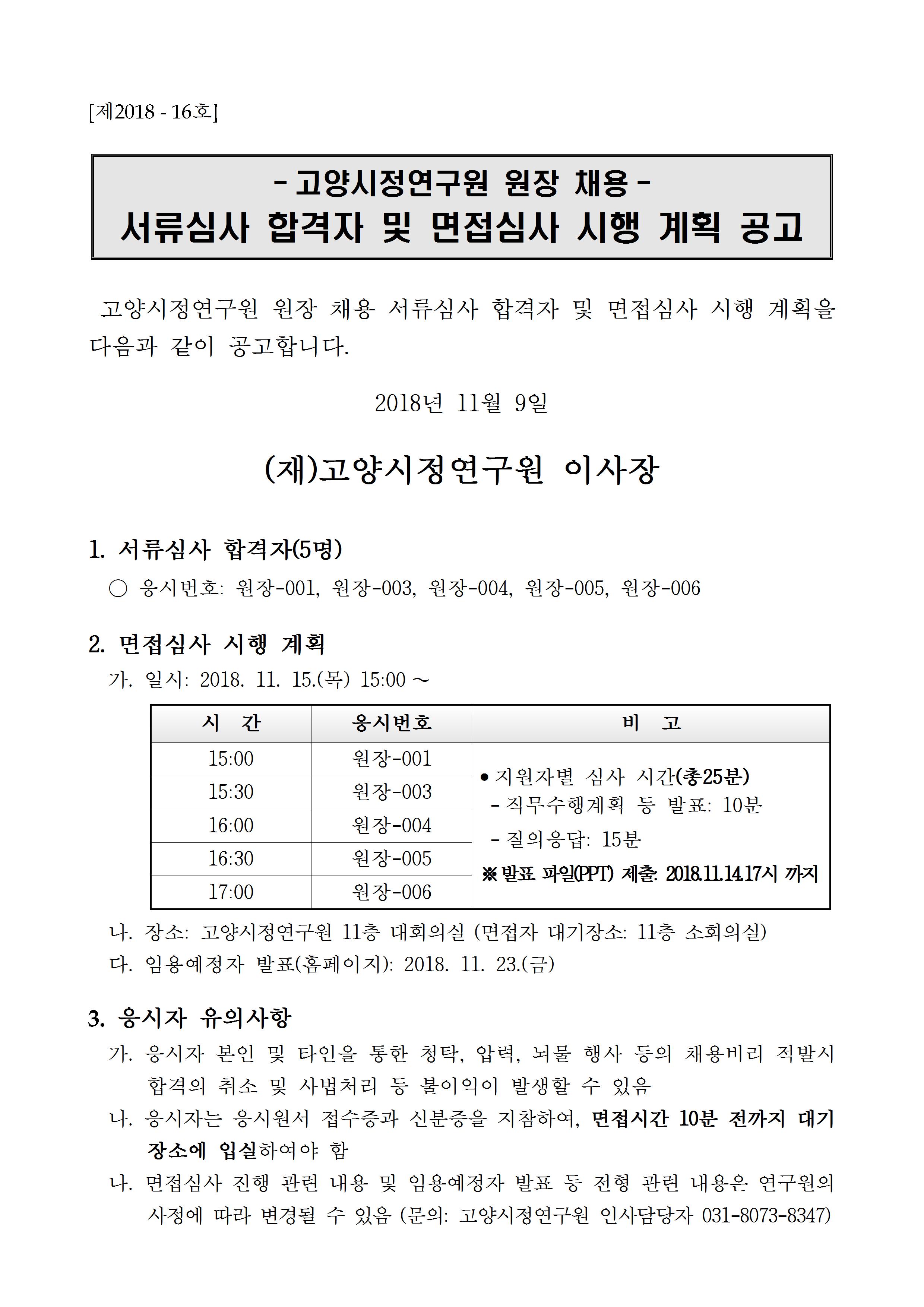 [제2018-16호] 고양시정연구원 원장채용 서류심사 합격자 및 면접심사 시행계획 공고