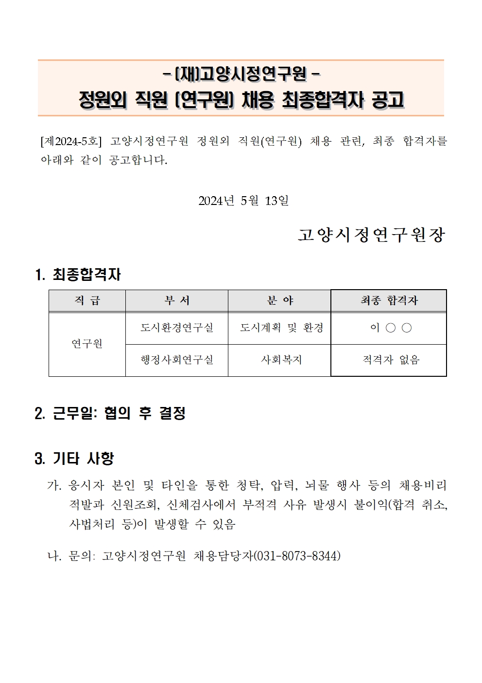 [제2024-5호] 고양시정연구원 정원외 직원(연구원) 채용 최종합격자 공고