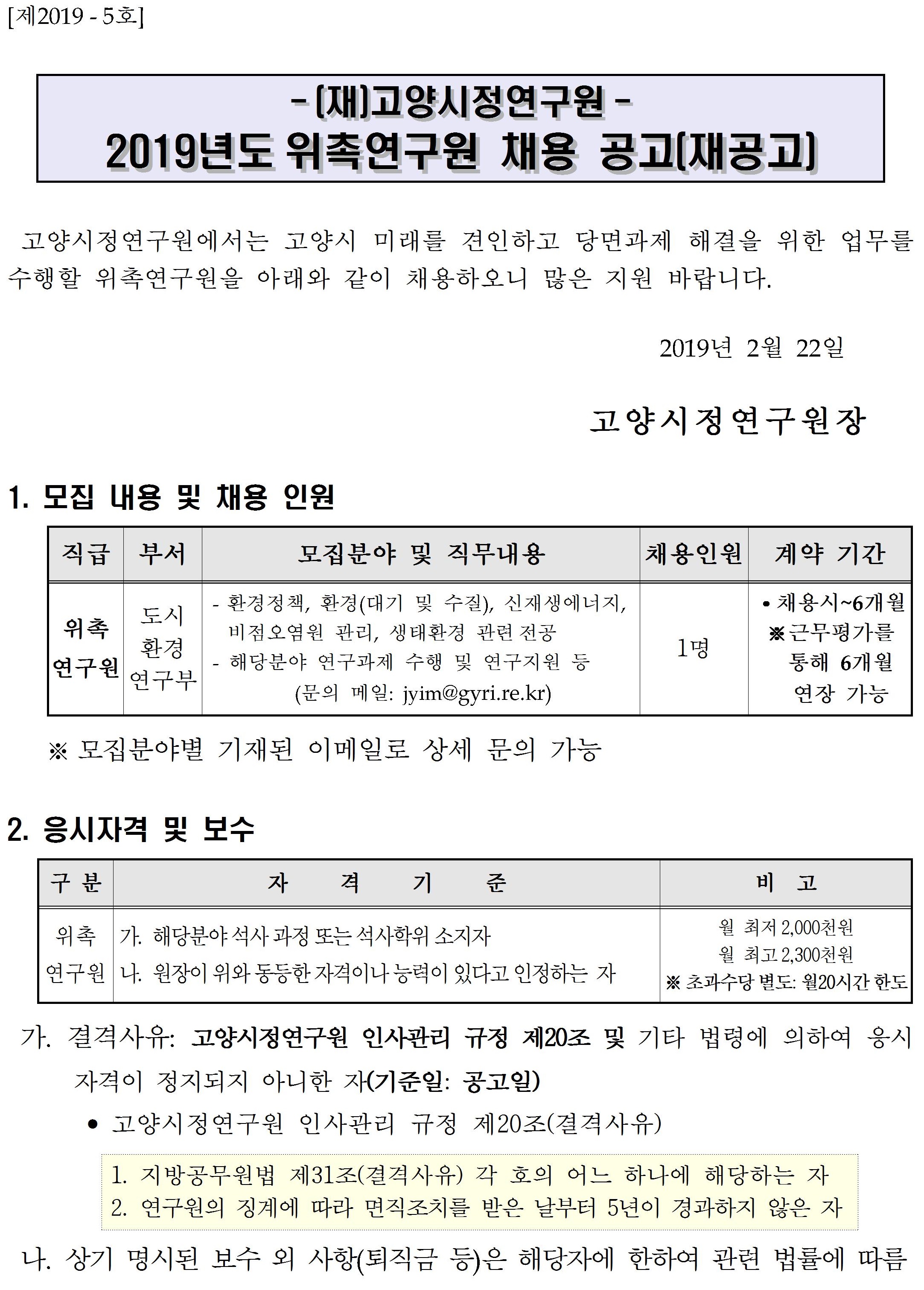 [제2019-6호] 고양시정연구원 2019년 위촉연구원 채용 공고(재공고)
