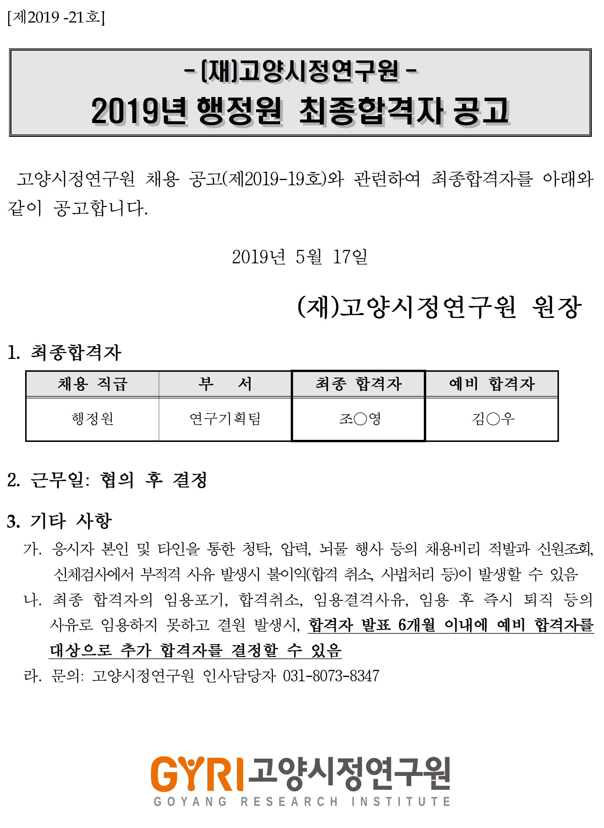 [제2019-21호] 고양시정연구원 2019년 행정원(연구기획팀) 채용 최종 합격자 공고