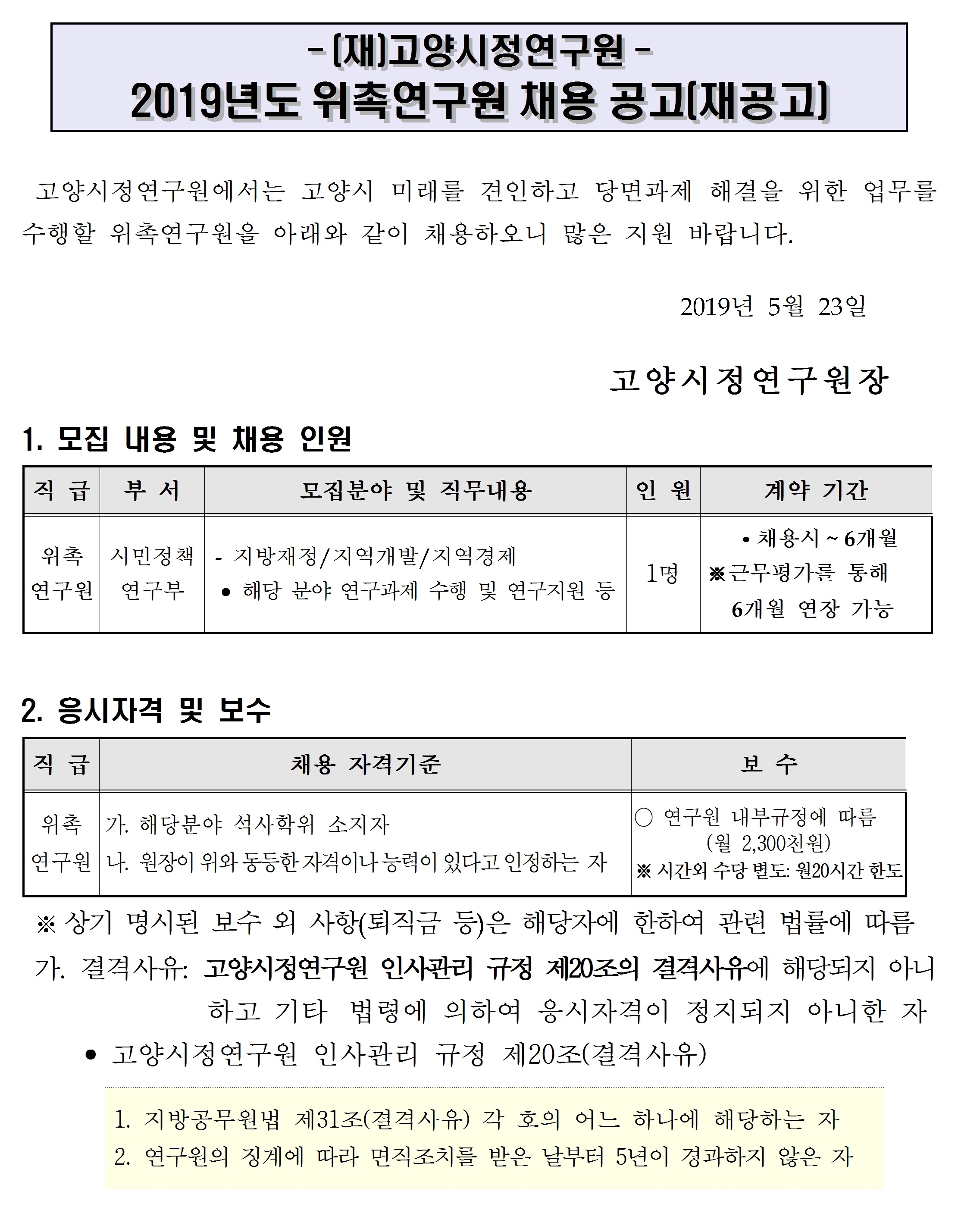 20190523_고양시정연구원 2019년 위촉연구원-시민정책연구부 채용 공고문_재공고.hwp