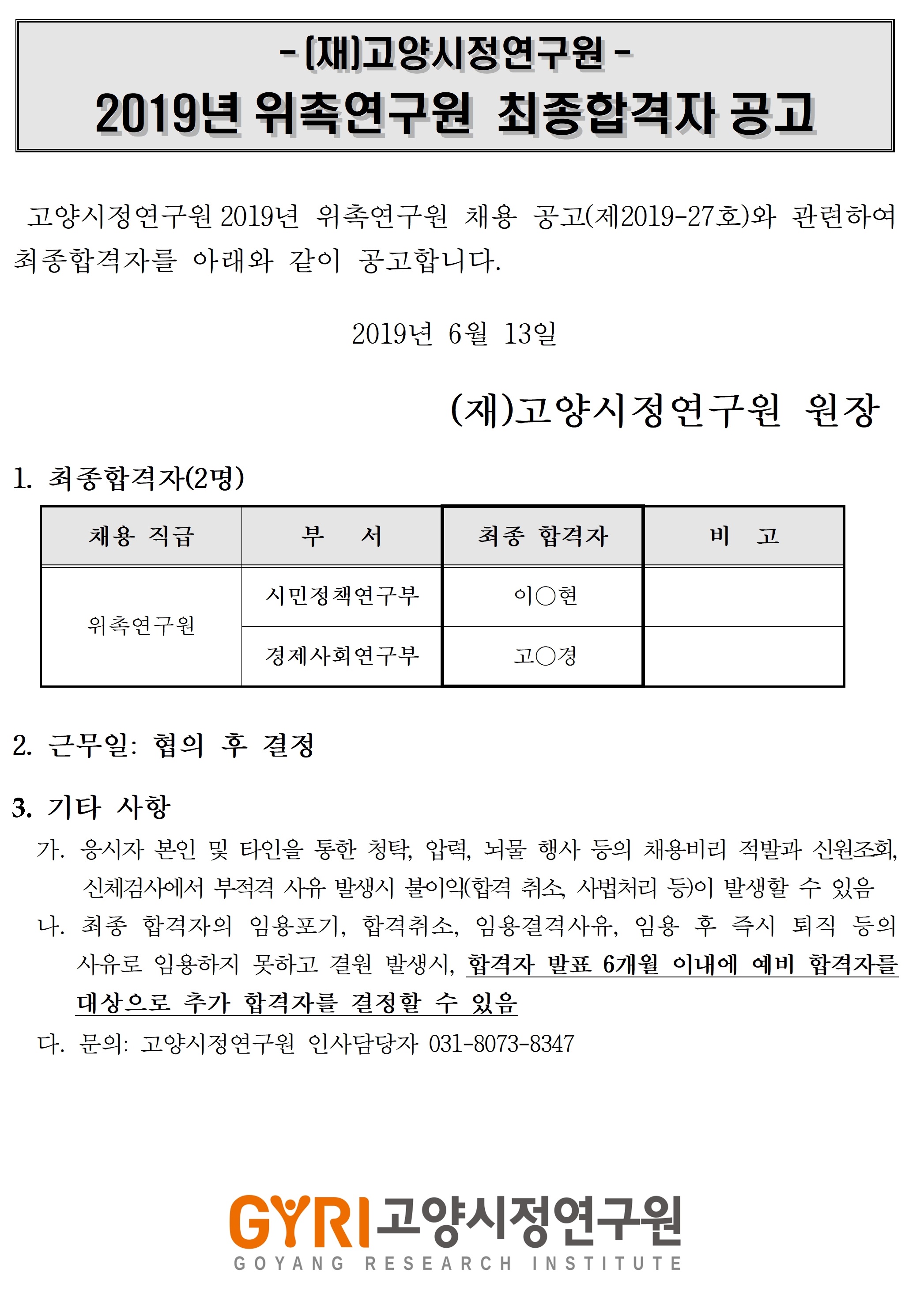 [제2019-28호] 고양시정연구원 위촉연구원 최종합격자 공고문