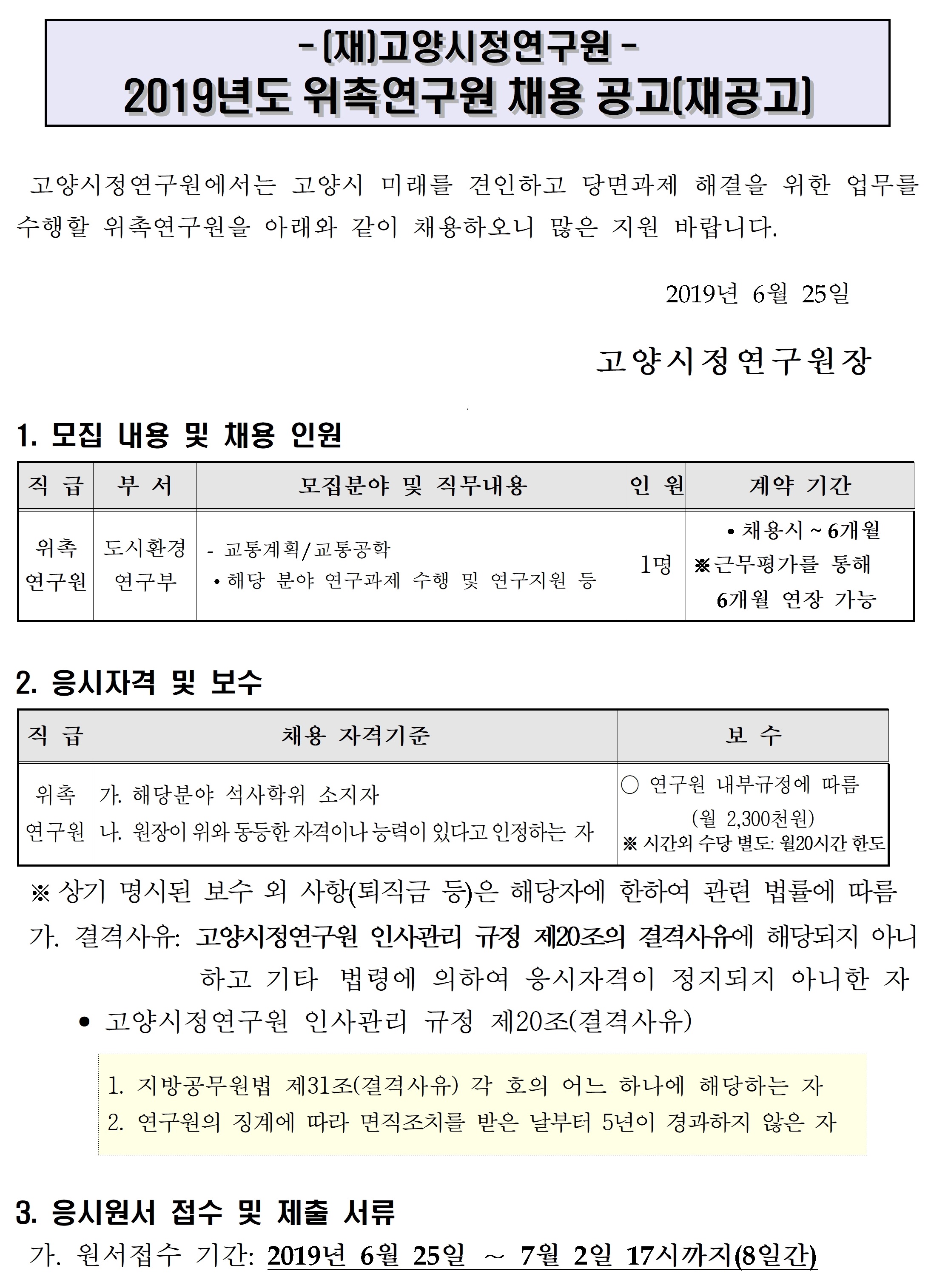 [제2019-29호] 고양시정연구원 2019년 위촉연구원(도시환경연구부) 채용 공고문(재공고)