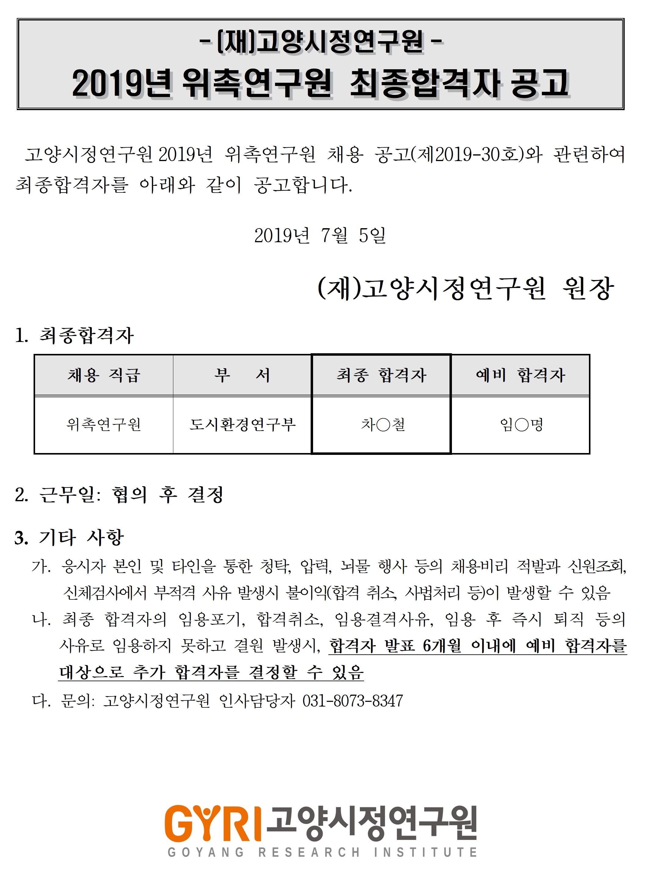 [제2019-31호] 고양시정연구원 위촉연구원(도시환경연구부) 최종합격자 공고문