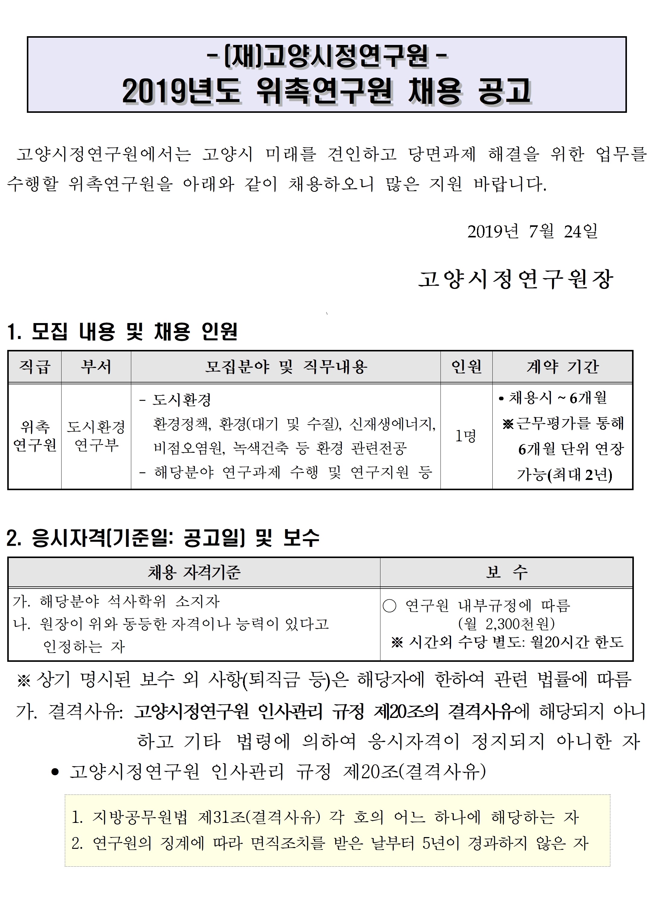 [제2019-32호] 고양시정연구원 2019년 위촉연구원(도시환경연구부) 채용 공고문