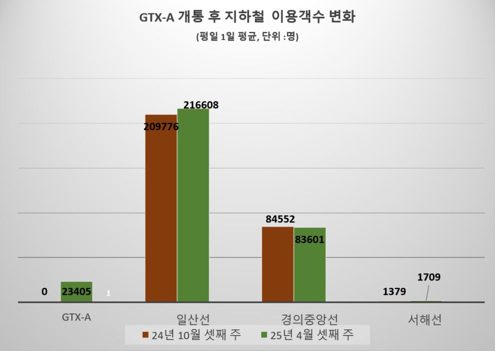이에 비해 GTX-A 개통 이후 킨텍스역과 근접한 일산선 대화역, 주엽역의 평일 1일평균 이용객 수는 18.7%(2만4279명⟶1만9740명), 6.6%(1만7900명⟶1만6715명)